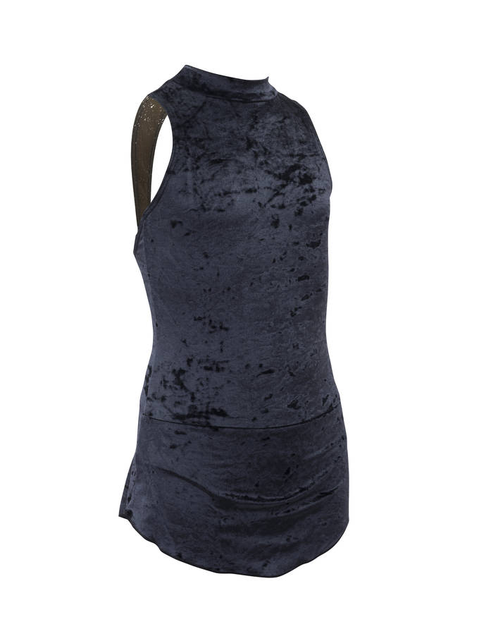 Malla de patinaje artístico de entrenamiento. La falda y el cuerpo están confeccionados con terciopelo elástico. La espalda está confeccionada con tejido de transparencia. La malla lleva incorporada la braguita, confeccionada con el mismo terciopelo de la falda y forrada en las zonas intimas. Se abrocha por la espalda con un botón de click
