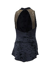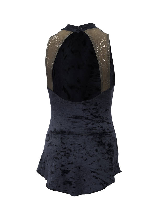 Malla de patinaje artístico de entrenamiento. La falda y el cuerpo están confeccionados con terciopelo elástico. La espalda está confeccionada con tejido de transparencia. La malla lleva incorporada la braguita, confeccionada con el mismo terciopelo de la falda y forrada en las zonas intimas. Se abrocha por la espalda con un botón de click